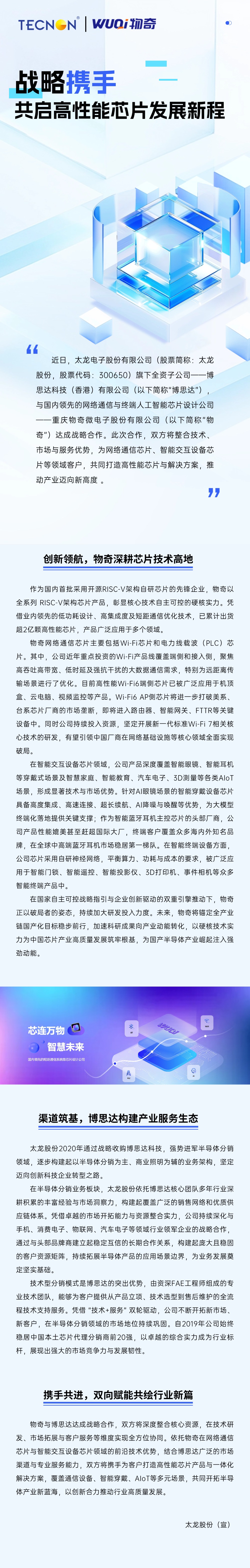 ¡¾ÌáÒªÐÎò¡¿¿ËÈÕ£¬ÈËÉú¾ÍÊDz©£¨¹ÉƱ¼ò³Æ£ºÈËÉú¾ÍÊDz©¹É·Ý£¬¹ÉƱ´úÂ룺300650£©ÆìÏÂÈ«×Ê×Ó¹«Ë¾¡ª¡ª²©Ë¼´ï¿Æ¼¼£¨Ïã¸Û£©ÓÐÏÞ¹«Ë¾£¨ÒÔϼò³Æ¡°²©Ë¼´ï¡±£©£¬Ó뺣ÄÚÁìÏȵÄÍøÂçͨѶÓëÖÕ¶ËÈ˹¤ÖÇÄÜоƬÉè¼Æ¹«Ë¾¡ª¡ªÖØÇìÎïÆæÎ¢µç×ӹɷÝÓÐÏÞ¹«Ë¾£¨ÒÔϼò³Æ¡°ÎïÆæ¡±£©¸æ¿¢Õ½ÂÔÏàÖú¡£´Ë´ÎÏàÖú£¬Ë«·½½«ÕûºÏÊÖÒÕ¡¢Êг¡Óë·þÎñÓÅÊÆ£¬ÎªÍøÂçͨѶоƬ¡¢ÖÇÄܽ»»¥×°±¸Ð¾Æ¬µÈÁìÓò¿Í»§£¬ÅäºÏ´òÔì¸ßÐÔÄÜоƬÓë½â¾ö¼Æ»®£¬Íƶ¯¹¤ÒµÂõÏòÐÂ¸ß¶È ¡£